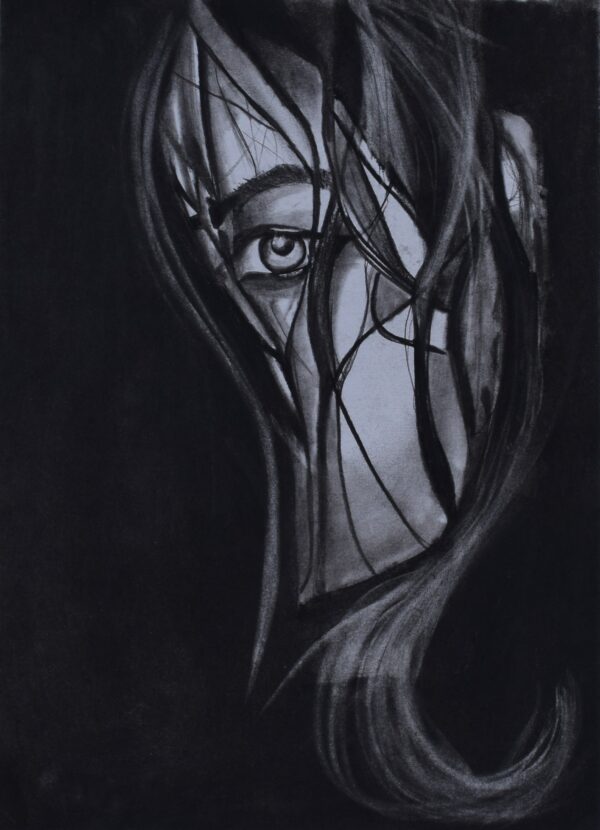 “The Stare 2” presents a captivating scene as a girl peers sideways through cascading hair. Half her face shrouded, only one intense eye emerges, reflecting palpable fear. The artwork resonates with an enigmatic intensity, inviting viewers to unravel the mystery behind her apprehensive gaze.