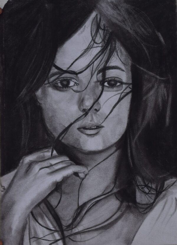 “Embracing My Hair” is a captivating charcoal artwork that celebrates the intimate connection between a woman and her flowing locks. Facing the camera, she tenderly plays with her exquisite hair, embodying a sense of self-acceptance and affection for her natural beauty. This piece beautifully portrays the act of embracing one’s unique essence.